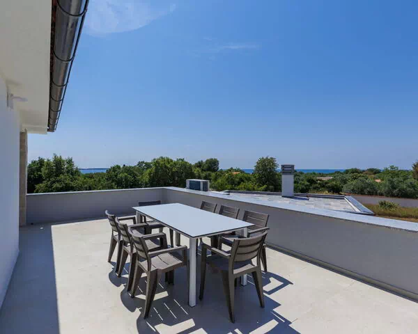 6-Zimmer-Villa 200 m2 auf 2 Stockwerken. Wohn-/Esszimmer mit Sat-TV (Flachbildschirm), Klimaanlage. Ausgang zum Garten, zum Schwimmbad. 2 Zimmer, jedes Zimmer mit 2 franz. Betten (160 cm, Länge 200 cm), Dusche/WC und Sat-TV (Flachbildschirm), Klimaanlage. Ausgang zur Terrasse. Offene Küche (Backofen, Geschirrspüler, 4 Glaskeramikplatten, Toaster, Wasserkocher, Mikrowelle, Tiefkühler, elektrische Kaffeemaschine). Sep. WC. Obergeschoss: 3 Zimmer, jedes Zimmer mit 1 franz. Bett (160 cm, Länge 200 cm), Dusche/WC und Sat-TV (Flachbildschirm), Klimaanlage. Terrasse 6 m2. Terrassenmöbel, Liegestühle. Eingeschränkte Sicht auf das Meer. Zur Verfügung: Haartrockner. Internet (WLAN, gratis). Maximal 1 Haustier/Hund erlaubt.