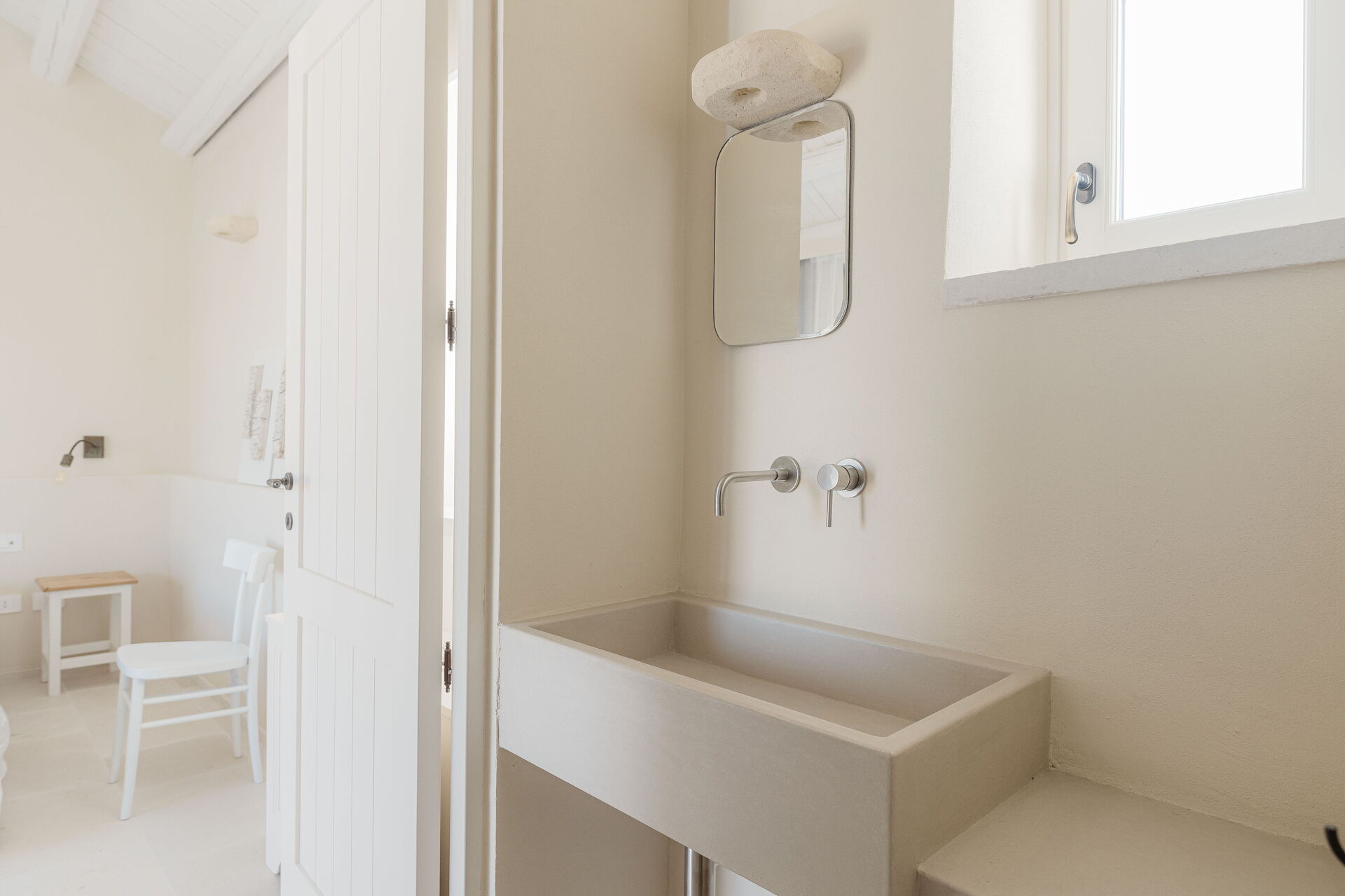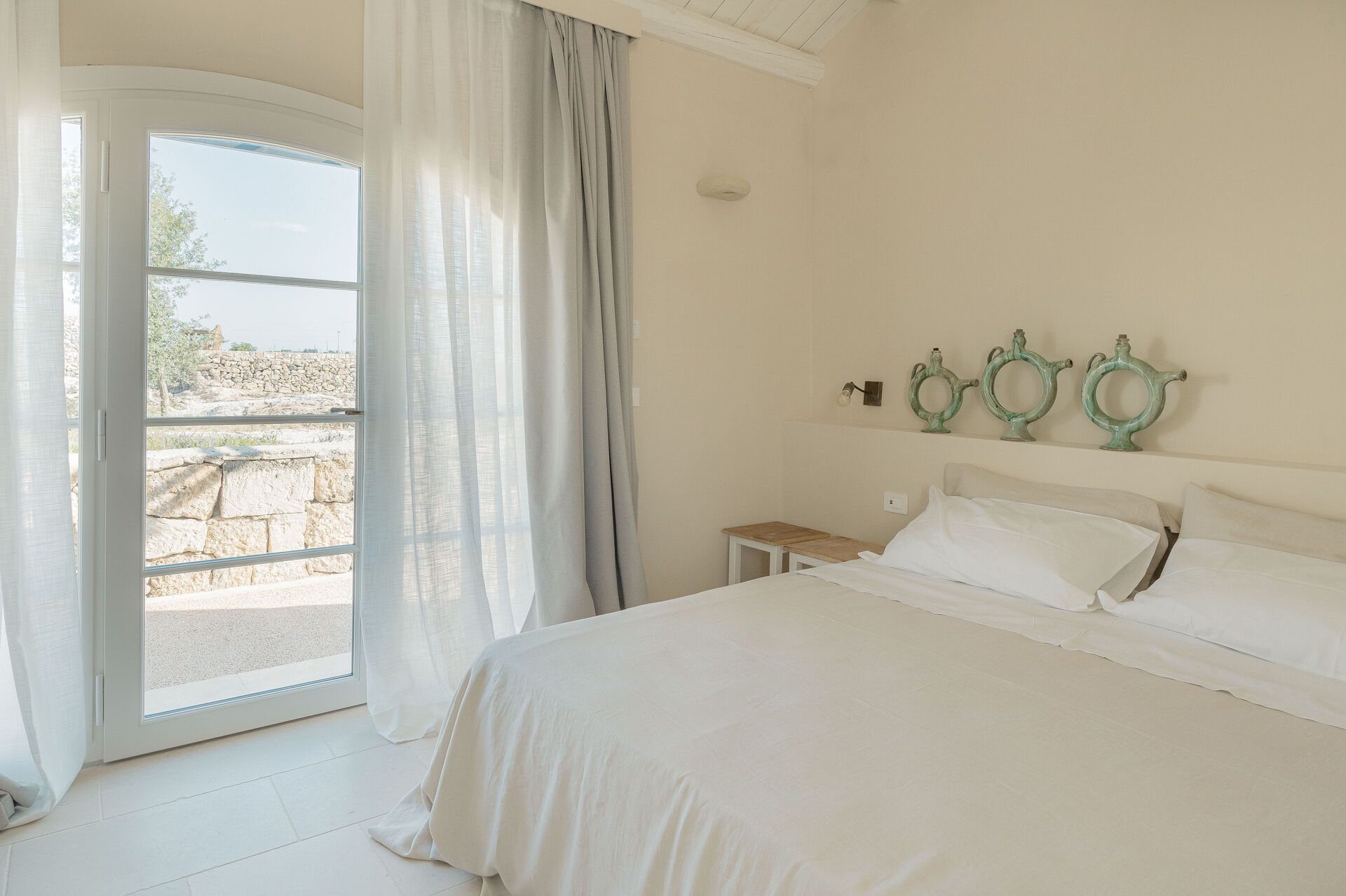 "Camera 1" is a stylish double bedroom with ensuite bathroom and view on garden in historic Masseria Vaccaro.