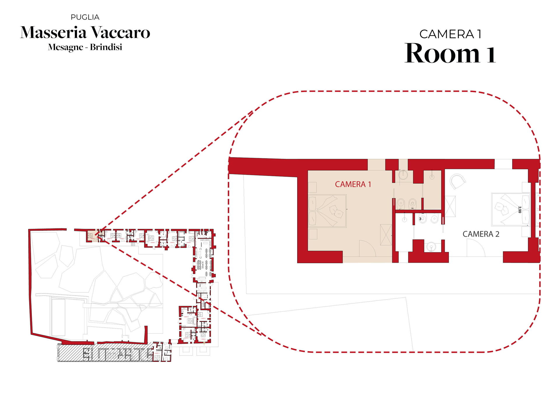Located on the ground floor of Masseria Vaccaro, it is a spacious and bright room for two people with external pergola, the ideal location for unforgettable stays and holidays in Puglia.