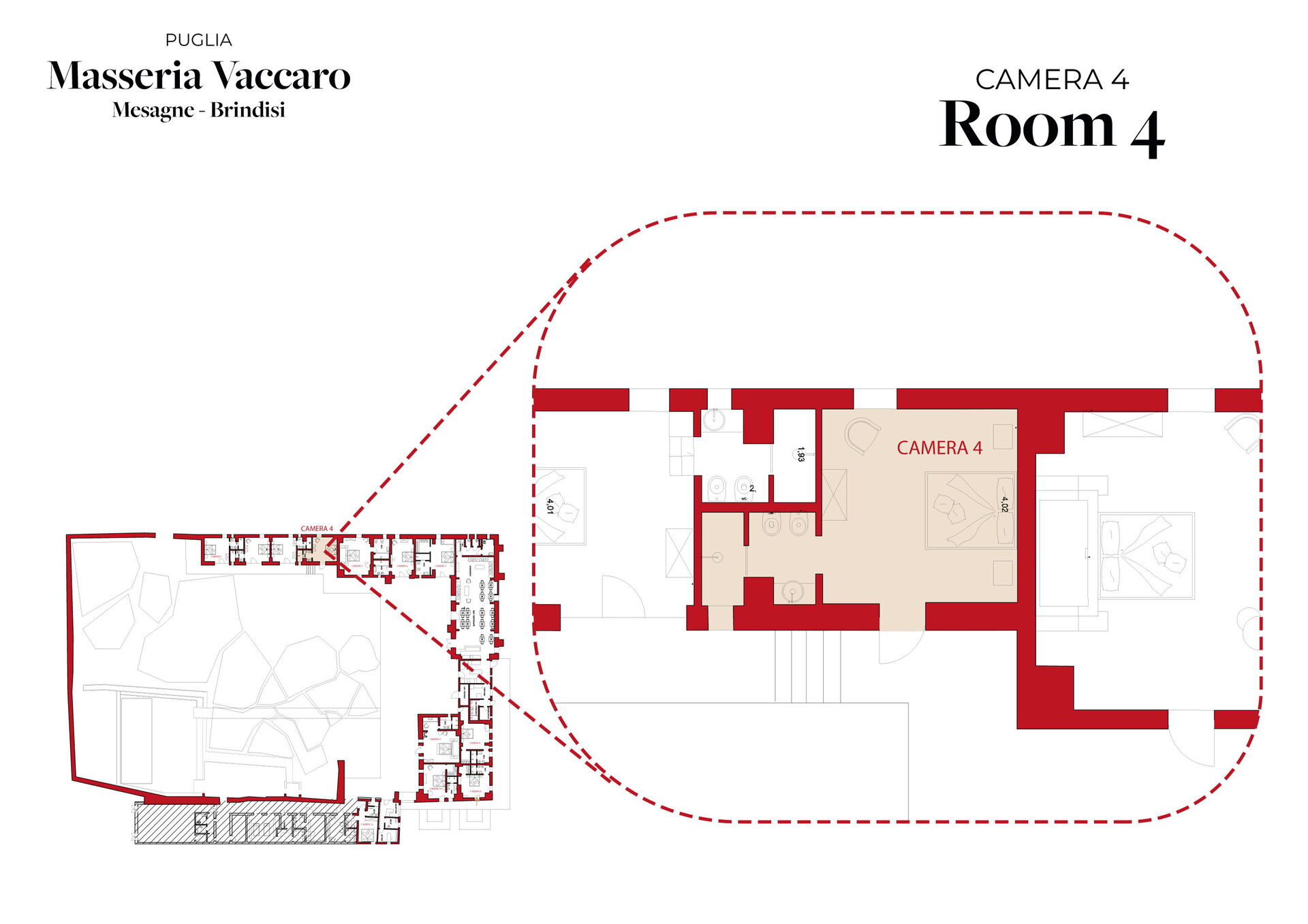 "Bedroom 4" is a stylish double bedroom with ensuite bathroom and view of the garden in historic Masseria Vaccaro.