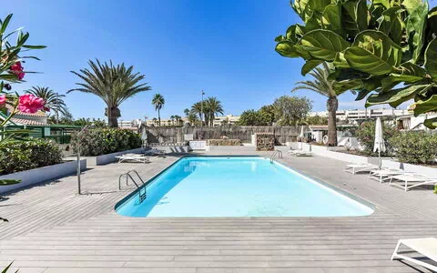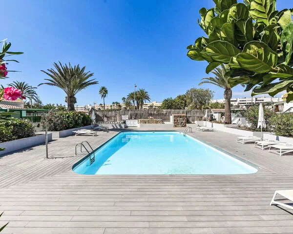 Der Außenbereich wird durch einen gemeinsamen, eckigen Swimmingpool geprägt, der das ganze Jahr über täglich von 10:00 bis 18:00 Uhr zur Verfügung steht. Der Pool bietet einen angenehmen Ort, um das warme Klima der Kanarischen Inseln zu genießen.