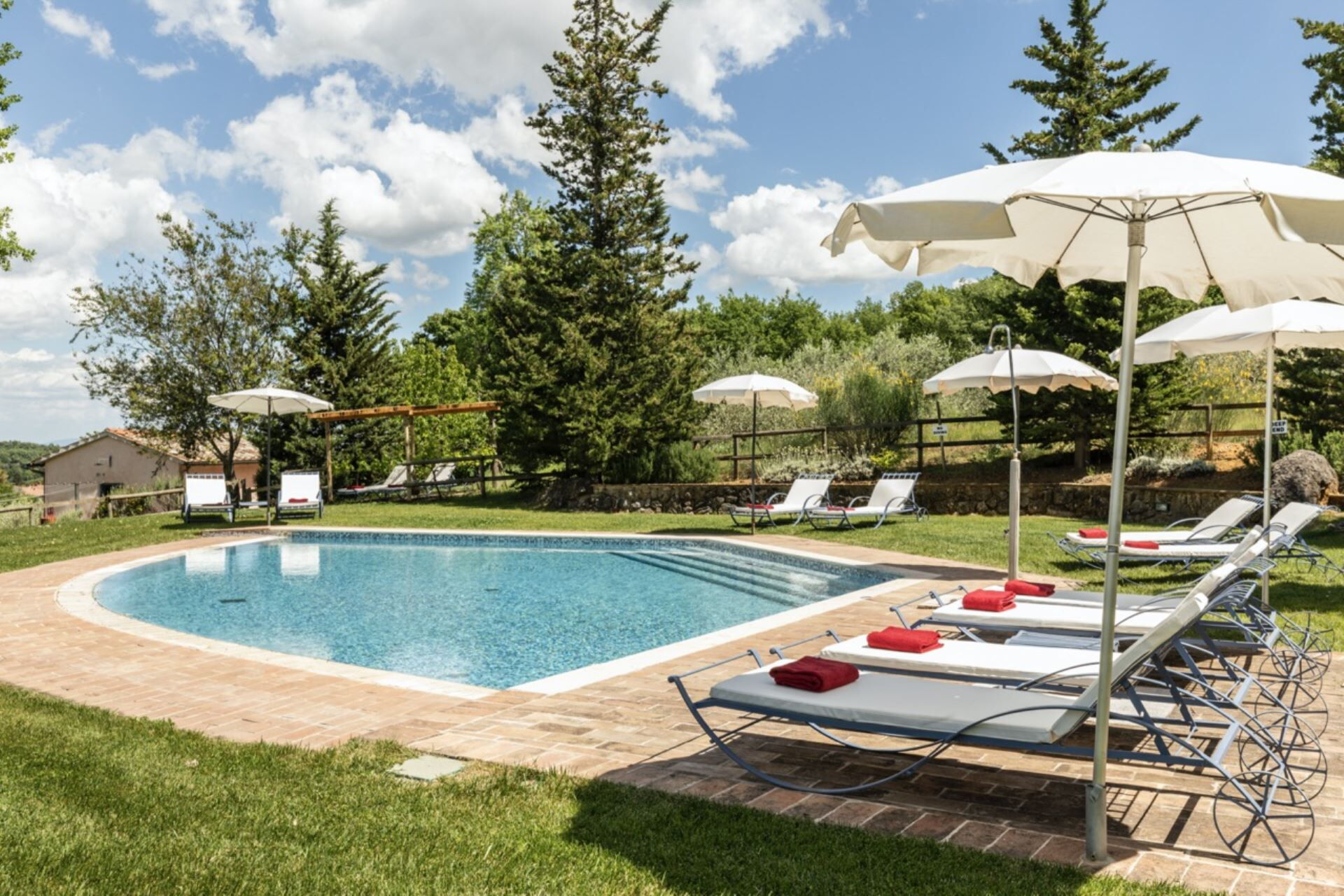 Das Anwesen verfügt über einen privaten unbeheizten Pool mit den Maßen 8 mal 16 Meter und einer Tiefe von 1,4 Metern, der Ihnen vom 15. Mai bis 30. September zur Verfügung steht. Sie werden einen natürlichen Teich im weitläufigen Garten entdecken, der wunderschön von Wäldern und Olivenhainen gesäumt ist und eine ruhige Umgebung für Entspannung im Freien schafft. Ein Pavillon mit Tischen und Stühlen befindet sich direkt vor der Küche und bietet einen idealen Raum für Mahlzeiten im Freien, während Sie die malerische toskanische Landschaft genießen. Pooltücher werden für Ihre Bequemlichkeit bereitgestellt, und das gesamte Anwesen ist eingezäunt, was Privatsphäre und Sicherheit während Ihres Aufenthalts gewährleistet.