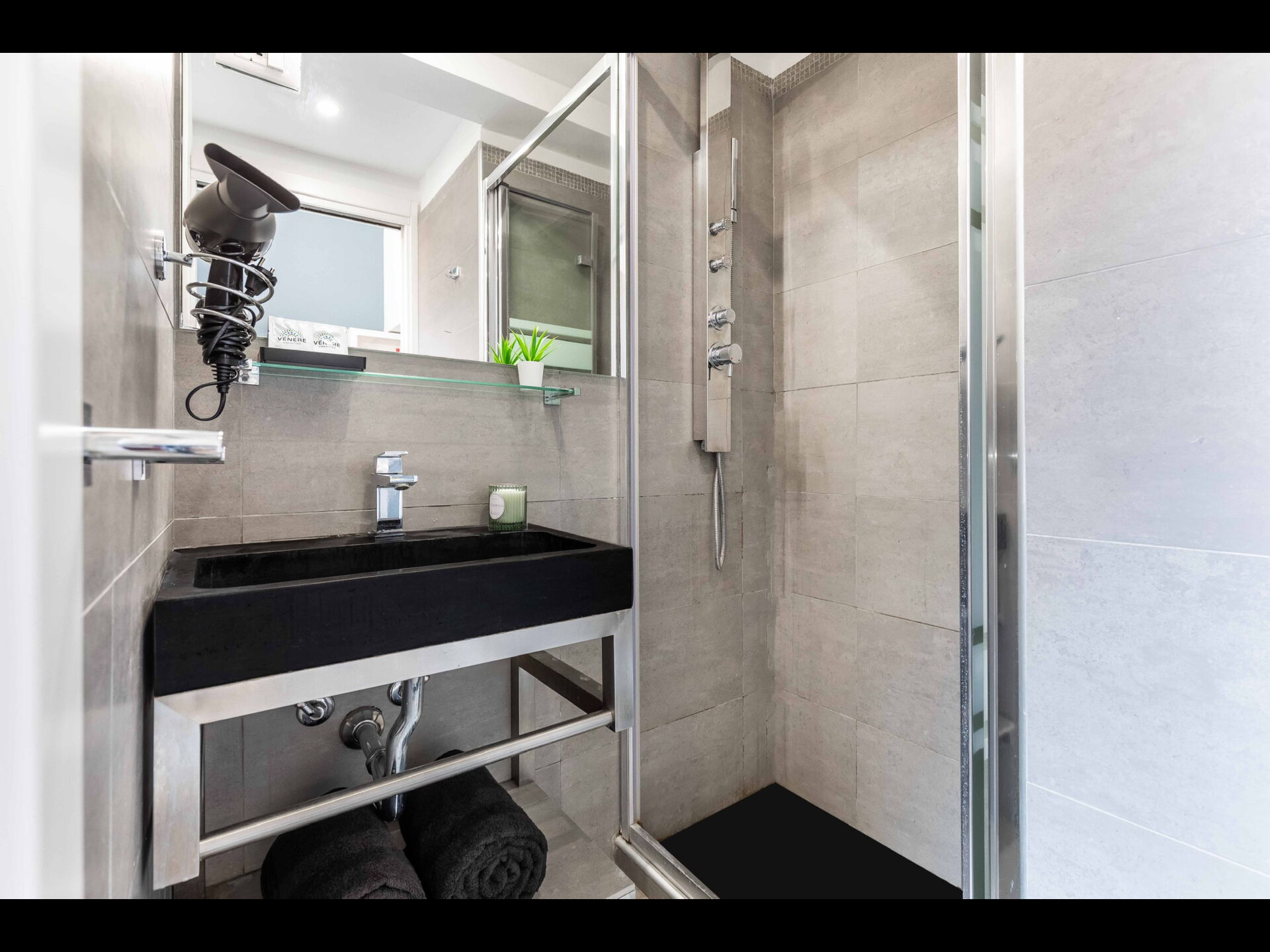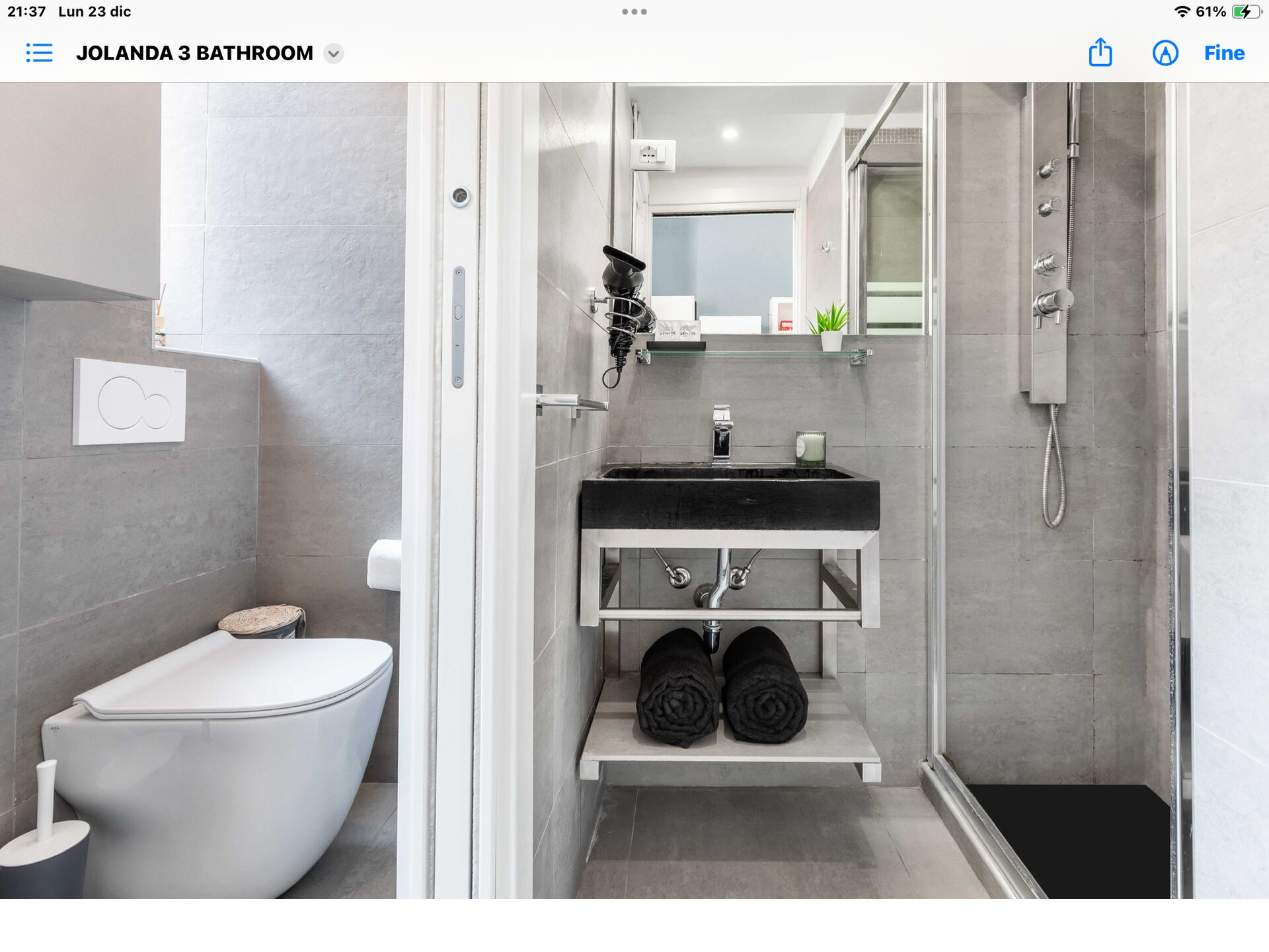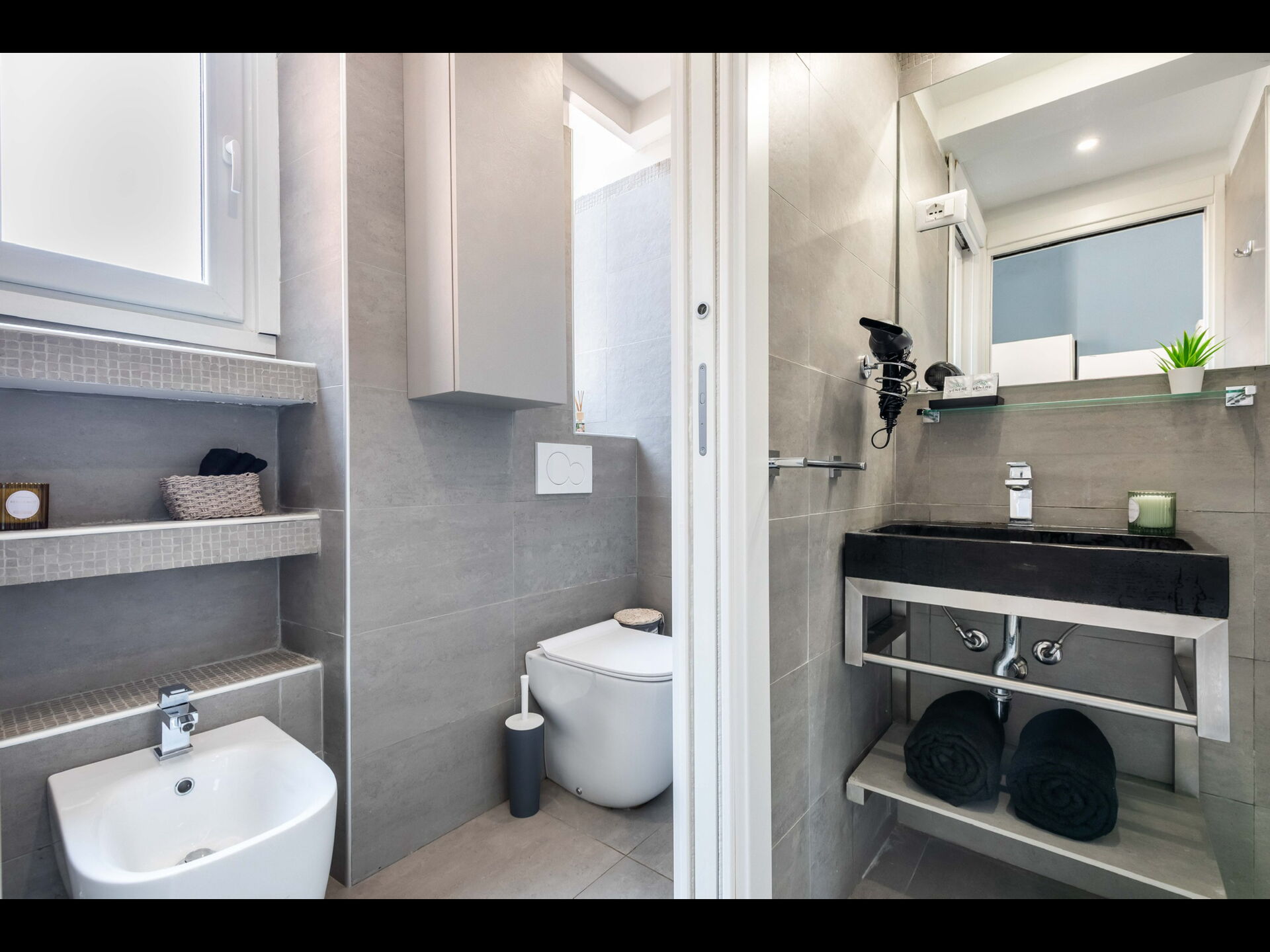 Badezimmer: Waschbecken, WC, Bidet, Dusche, Fön.