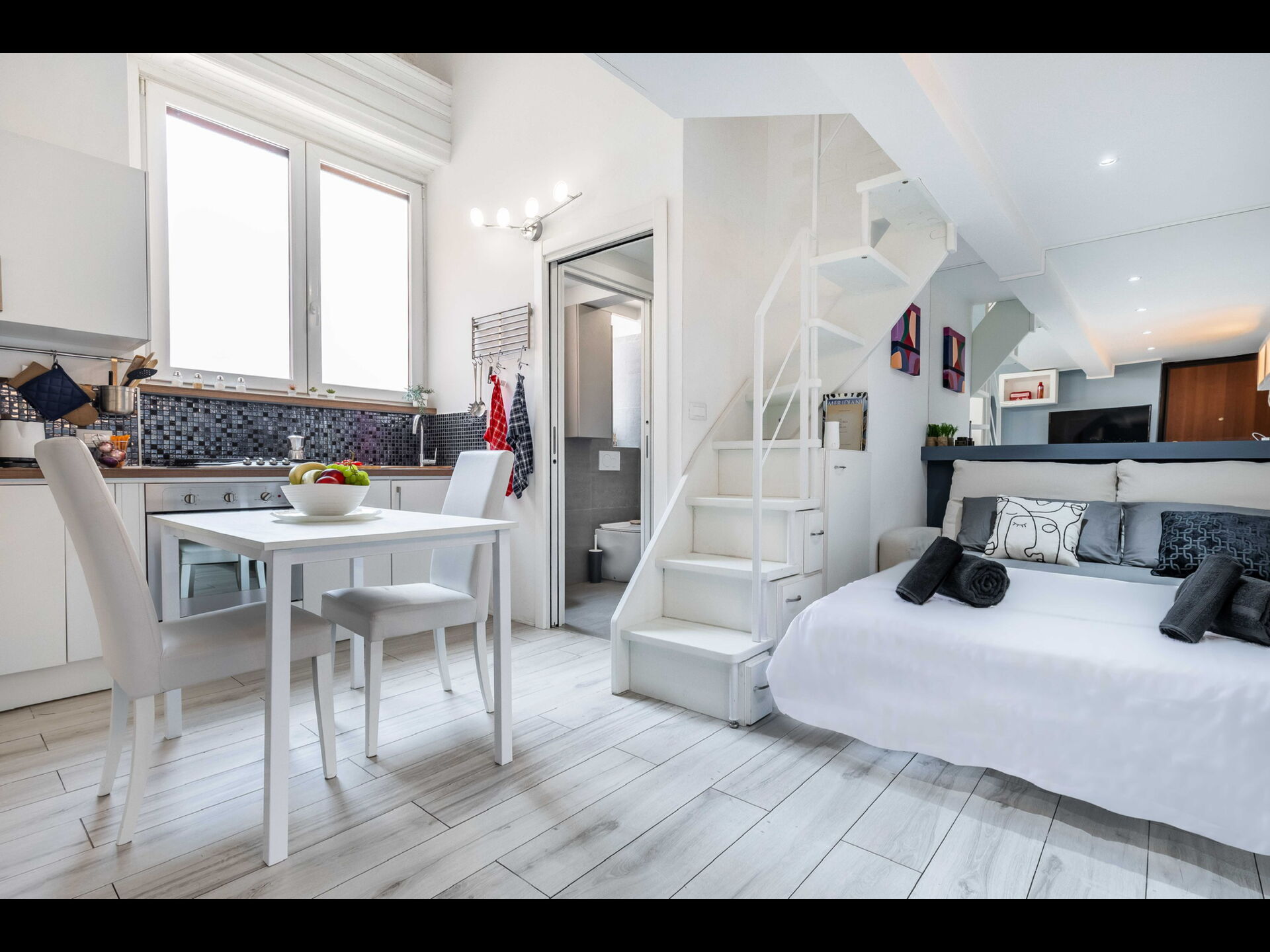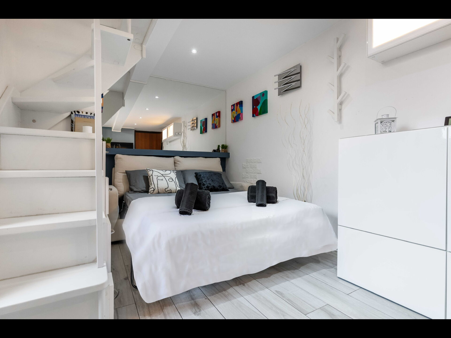 Schlafzimmer (12 m2): französisches Bett (Breite: 1.4m, Länge: 1.9m), WiFi Internet, Klimaanlage, Schreibtisch, Rauchmelder, CO2 Detektor, Galerie.