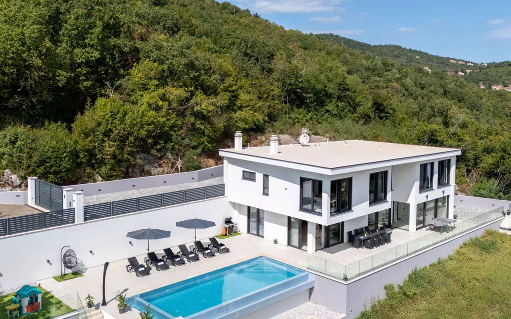 An einer etwas höher gelegenen Stelle, inmitten der malerischen und grünen Wälder, mit Blick auf das glitzernde Adriatische Meer und die charmante Küstenortschaft Opatija und 5km vom nächsten Strand entfernt, steht das Ferienhaus Opatija Sky. Ein prächtiges, modernes Ferienhaus mit 4 Stockwerken, in dem man einen traumhaften Urlaub in Kroatien verbringen kann. Alle wesentlichen Einrichtungen, die man braucht, sind nur einen kurzen Fußweg entfernt, die Bushaltestelle ist 900m entfernt, man hat die schönsten Ausblicke aufs Meer, es gibt Naturpfade, wo man spazieren und so richtig in die natürliche Schönheit eintauchen kann, einen privaten Swimming-Pool und herrliche Wohnbereiche - diese prächtige Unterkunft hat alles, was man sich wünschen könnte. Mit Platz für insgesamt 10 Gäste in 4 Schlafzimmern ist dieses große Ferienhaus der perfekte Stützpunkt an der Küste von Kroatien in der Region Primorje-Gorski Kotar.
