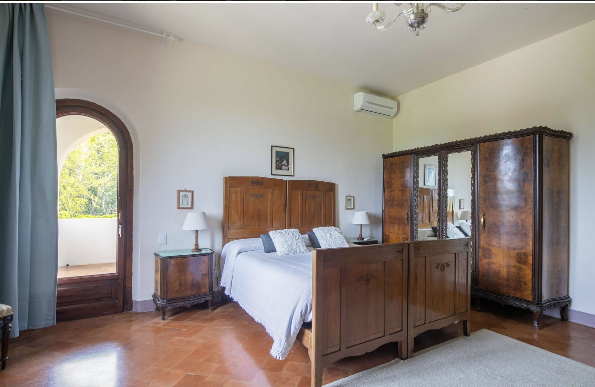 Schlafzimmer mit Bad 5: Doppelbett, WiFi Internet, Klimaanlage, Sofa, Schreibtisch, Waschbecken, WC, Bidet, Fön, Ausgang auf die Terrasse.