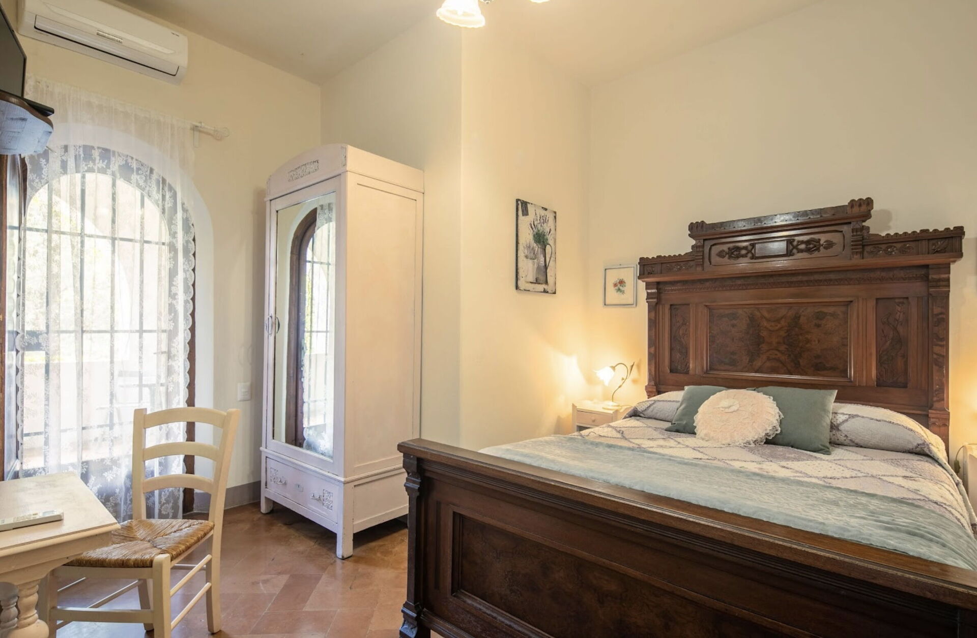 Schlafzimmer mit Bad 2 (1 m2): Doppelbett, WiFi Internet, Klimaanlage, Schreibtisch, Waschbecken, WC, Bidet, Dusche, Fön.