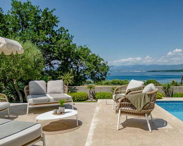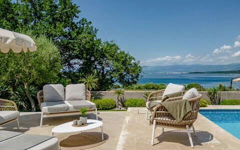 Zidarići 3 km von Malinska: Schönes Reihenhaus "Villa Prestige Deluxe", auf 2 Stockwerken. 2.6 km vom Zentrum von Malinska, 14 km vom Zentrum von Krk, 150 m vom Meer, 150 m vom Strand. Zur Mitbenutzung: Hallenbad eckig beheizt (6 x 3 m, 140 cm tief, saisonale Verfügbarkeit: 01.Jan. - 01.Mai. und 01.Okt. - 31.Dez.) mit Innentreppe und Salzelektrolyse-Reinigungssystem. Poolpflege durch den Besitzer/Gärtner. Zur Alleinbenutzung: Grundstück 400 m2 (eingezäunt) mit Pflanzen und Bäumen, wunderschöner Garten zum Entspannen, Schwimmbad eckig (6 x 5 m, 140 cm tief, saisonale Verfügbarkeit: 01.Mai. - 01.Okt.) mit Innentreppe und Salzelektrolyse-Reinigungssystem. Aussendusche, Terrasse (100 m2), Gartenmöbel, Grill, Poolpflege durch den Besitzer/Gärtner. Im Hause: Internetzugang, Sauna, Fitnessraum, Ruheraum, Klimaanlage, Waschmaschine. Parkplatz (für 2 Autos) beim Haus auf dem Grundstück. Einkaufsgeschäft 1 km, Supermarkt 4 km, Restaurant 200 m, Bushaltestelle 1.7 km, Fähre 15 km, Steinstrand 150 m. Jacht-Hafen 15 km, Tennis 8 km. Bitte beachten: Flugplatz 12 km vom Haus. Sauna, Fitnessraum, Ruheraum zur Mitbenutzung. Der Innenpool wird nur in den Monaten außerhalb der Sommersaison beheizt.