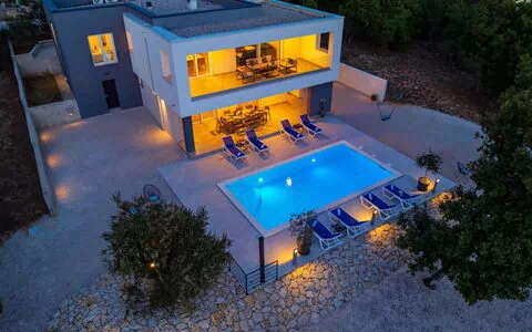 Moderne Villa "Green & Blue", auf 2 Stockwerken, Baujahr 2022. 28 km vom Zentrum von Zadar, sonnige, erhöhte Lage, 600 m vom Meer, 600 m vom Strand, an einer Strasse. Zur Alleinbenutzung: Grundstück 9'000 m2 (eingezäunt), Schwimmbad eckig (8 x 4 m, 150 cm tief, saisonale Verfügbarkeit: 15.Mai. - 15.Okt.). Aussendusche, Tischtennis, Gartenmöbel, Grill, Kinderspielplatz (Rutschbahn, Schaukel). Im Hause: Internetzugang, Billard, Waschmaschine. Parkplatz (für 3 Autos) beim Haus auf dem Grundstück. Einkaufsgeschäft 1 km, Restaurant 1.5 km, Bushaltestelle 1.5 km, Kieselstrand, Steinstrand 600 m. Nahe gelegene Sehenswürdigkeiten: NP Paklenica 17 km, Rafting Zrmanja 35 km. Der Besitzer akzeptiert keine Jugendgruppen.