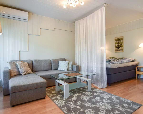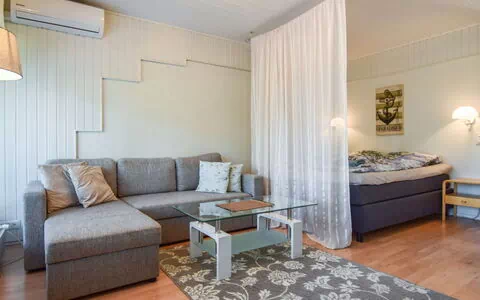 Board-paneled terraced house apartment 1975, living room-kitchen, hallway, living room with a 160 x 200 cm double bed and a sofa bed, which becomes an additional 140 x 200 cm bed for two. The living room-kitchen has a separate small oven / hob, microwave, airfryer, coffee maker, kettle and toaster.