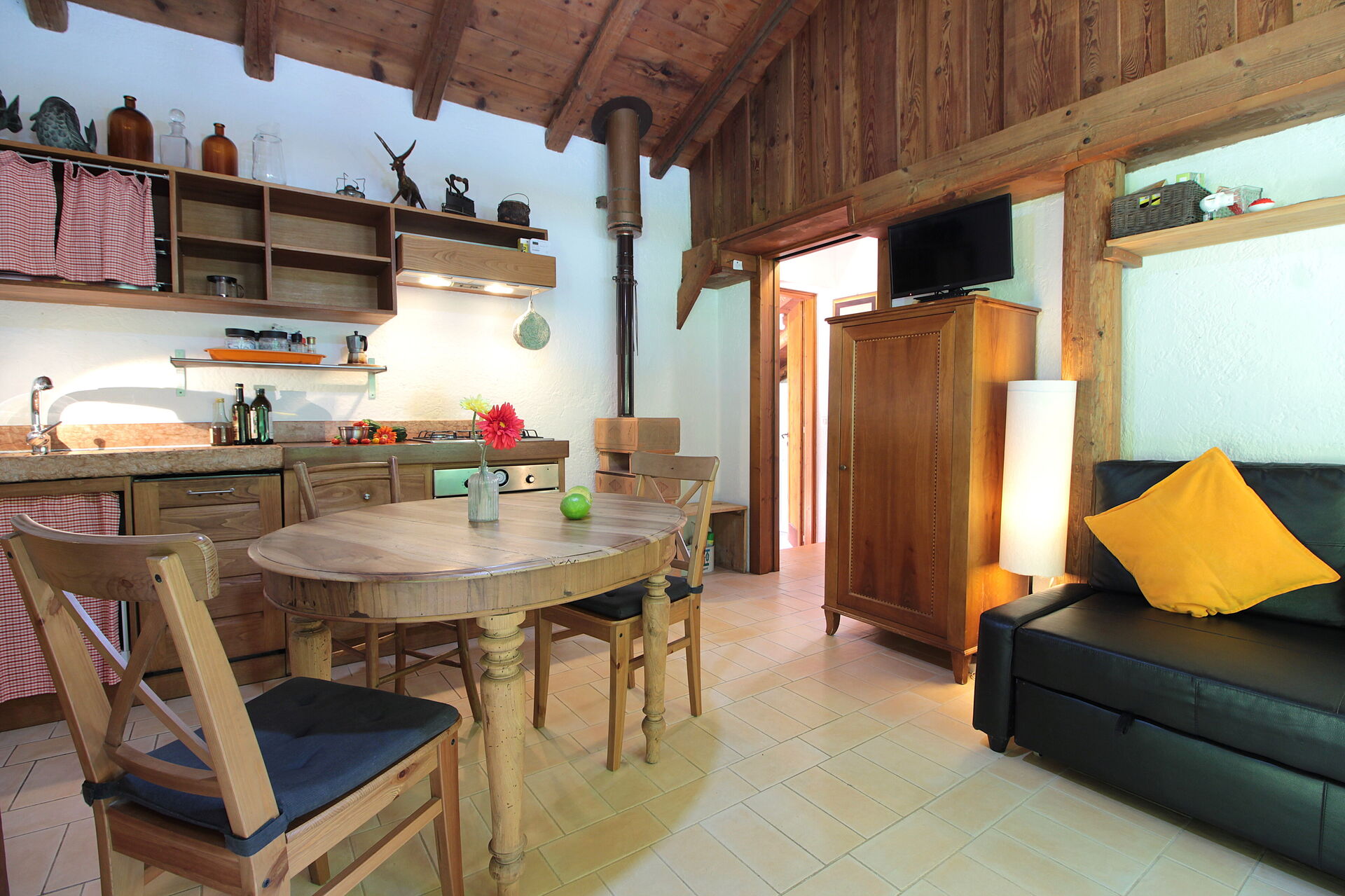 Wohnküche: gut ausgestattete Küche, Esstisch, Spülmaschine, Kühlschrank, Herd, Ofen, Italienische Kaffeemaschine, Doppel-Schlafsofa, WiFi Internet, TV.