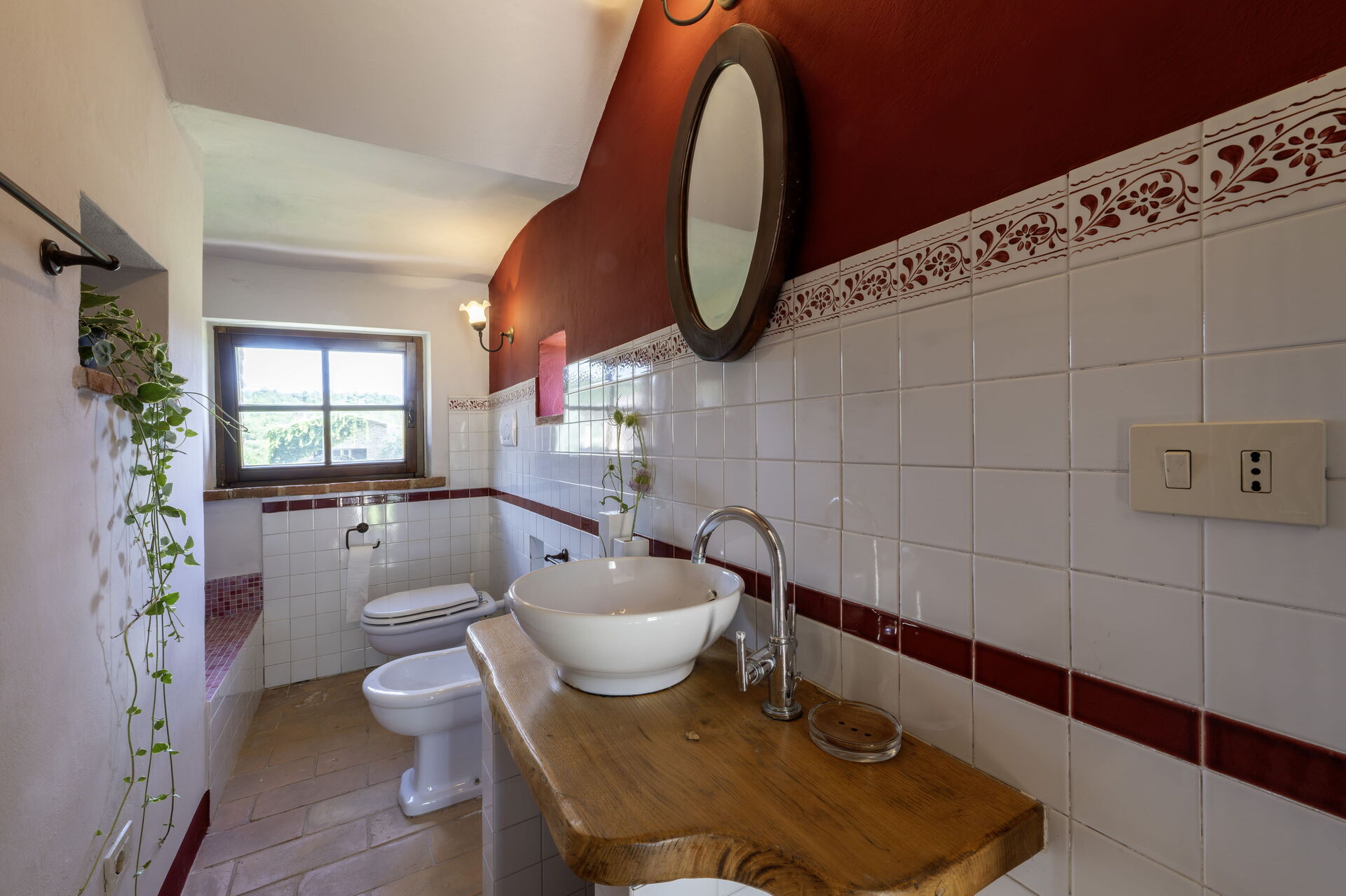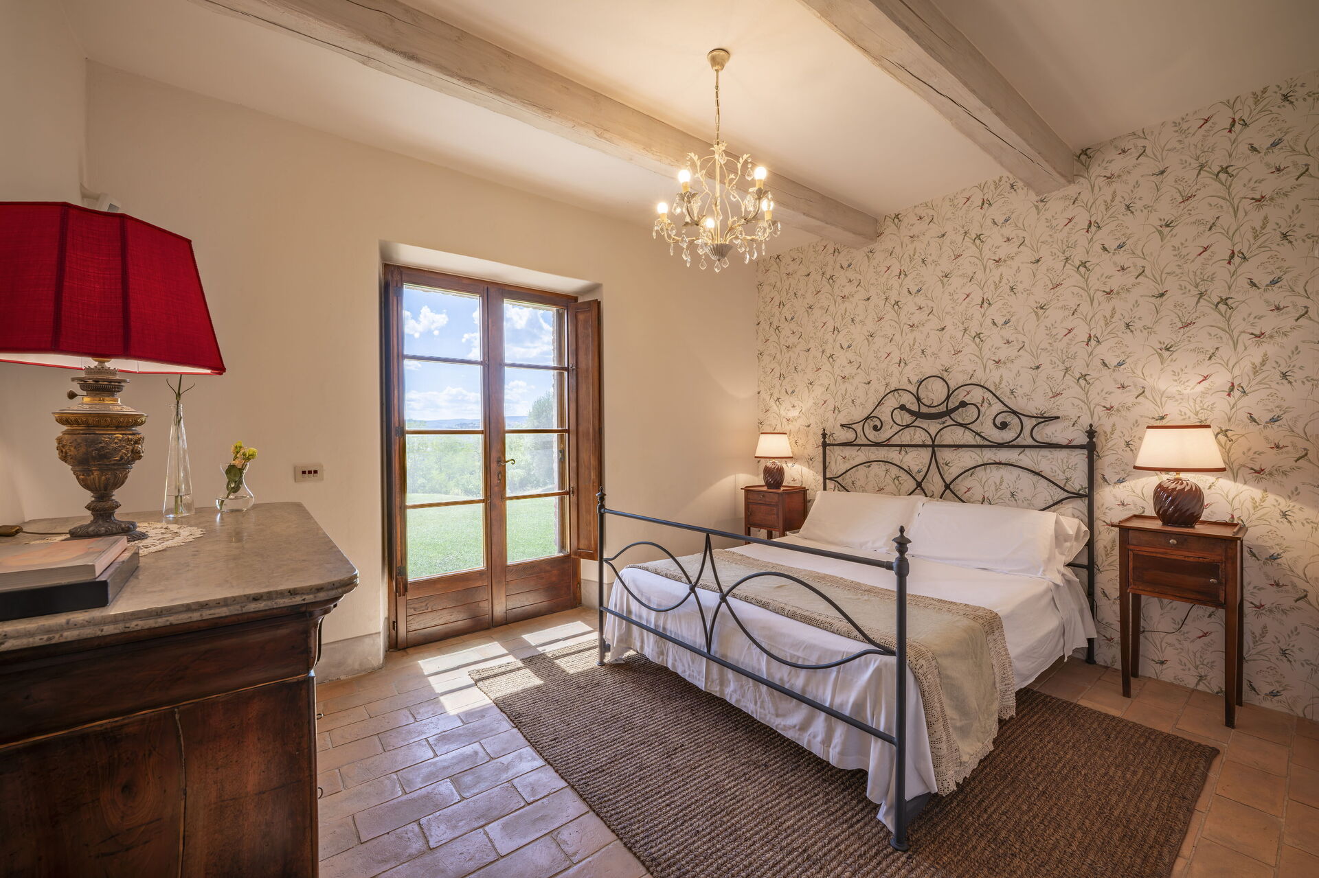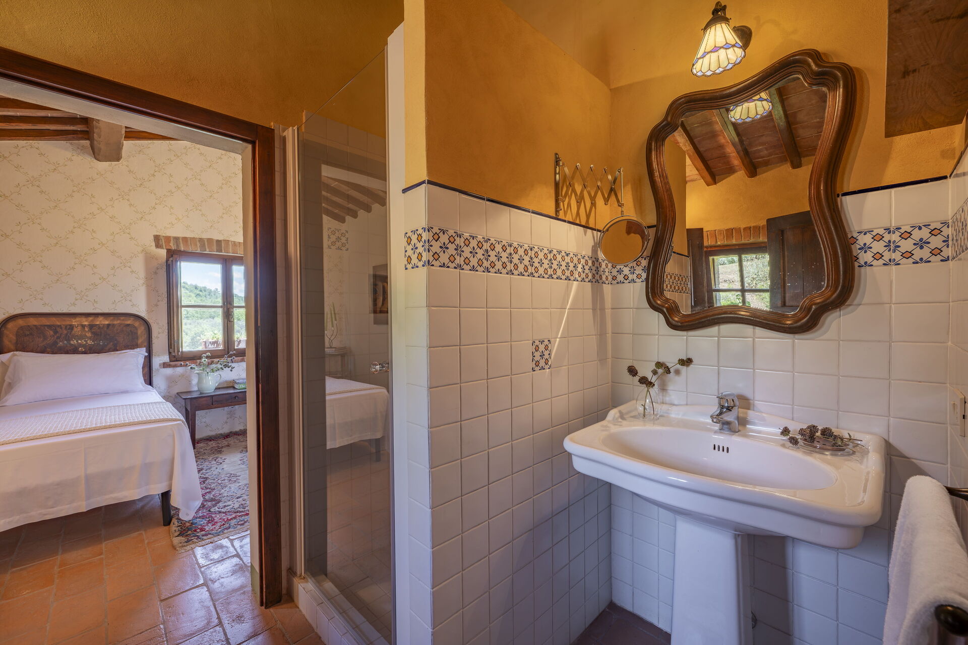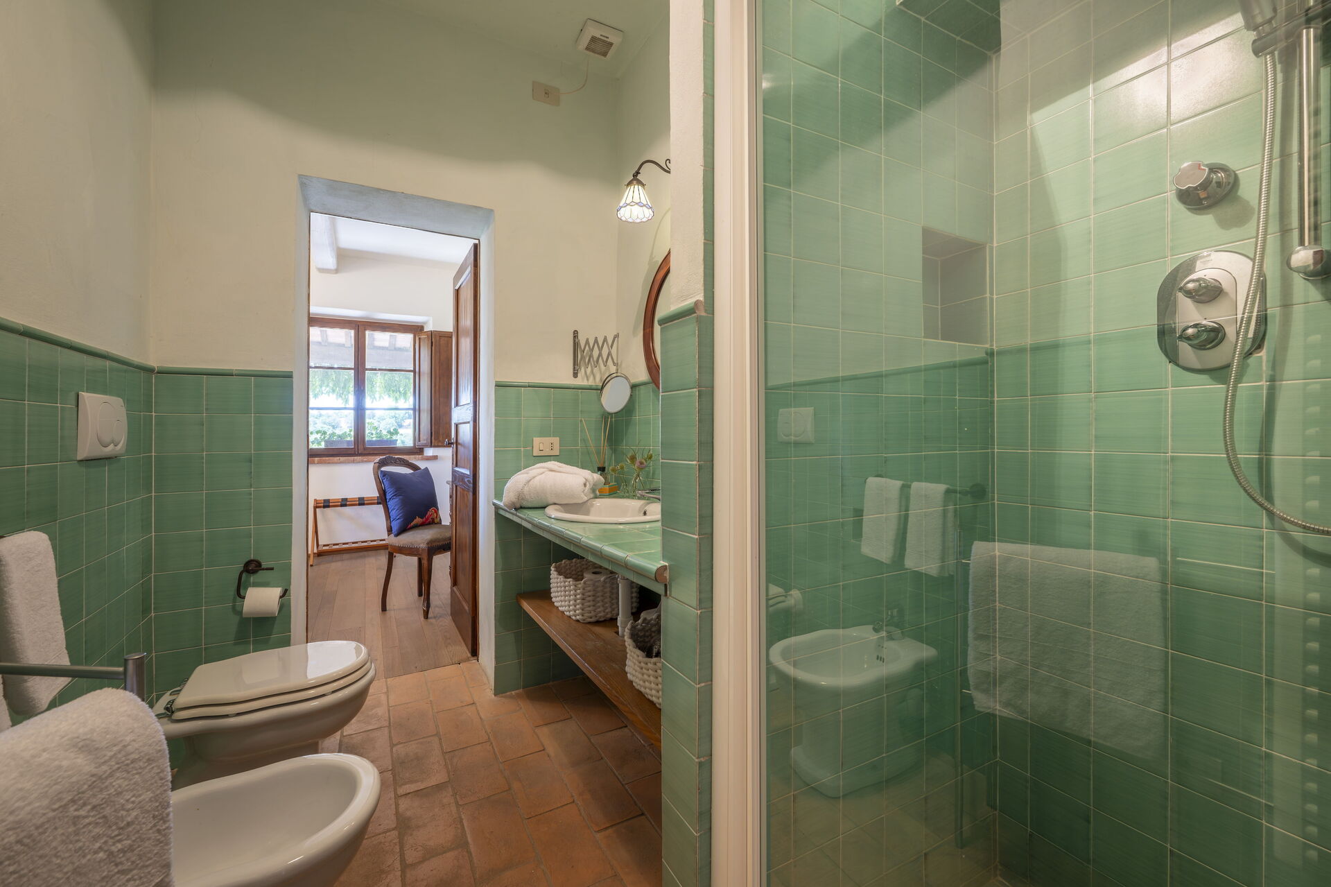 Schlafzimmer mit Bad: französisches Bett, WiFi Internet, Internet, Waschbecken, WC, Dusche, Ausgang auf den Garten.