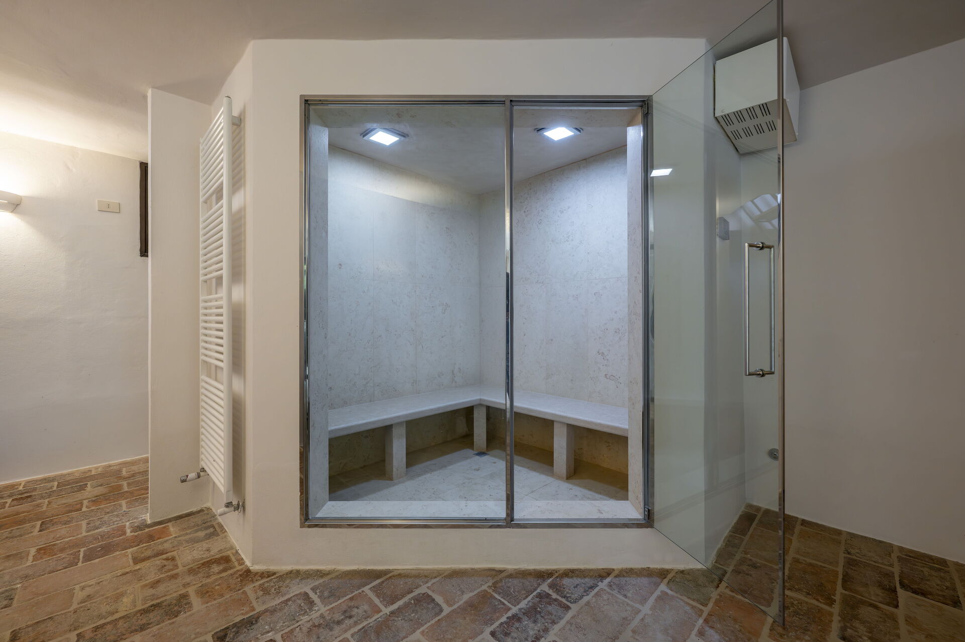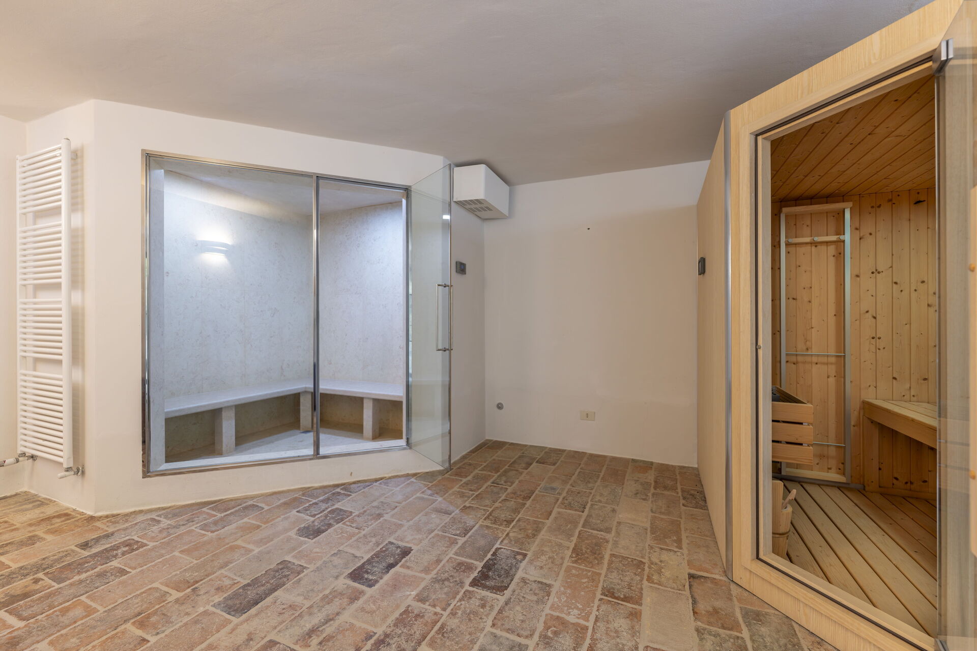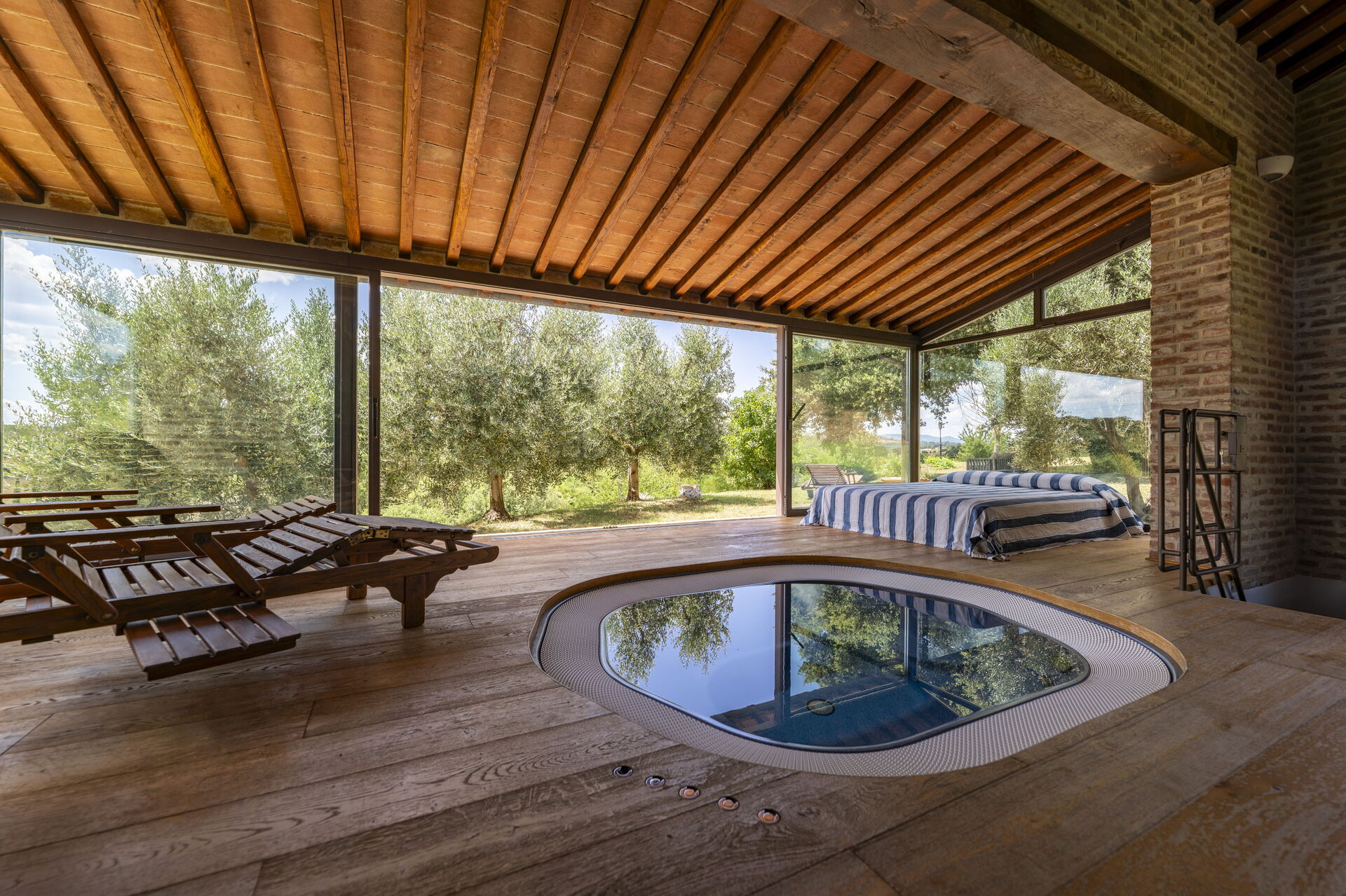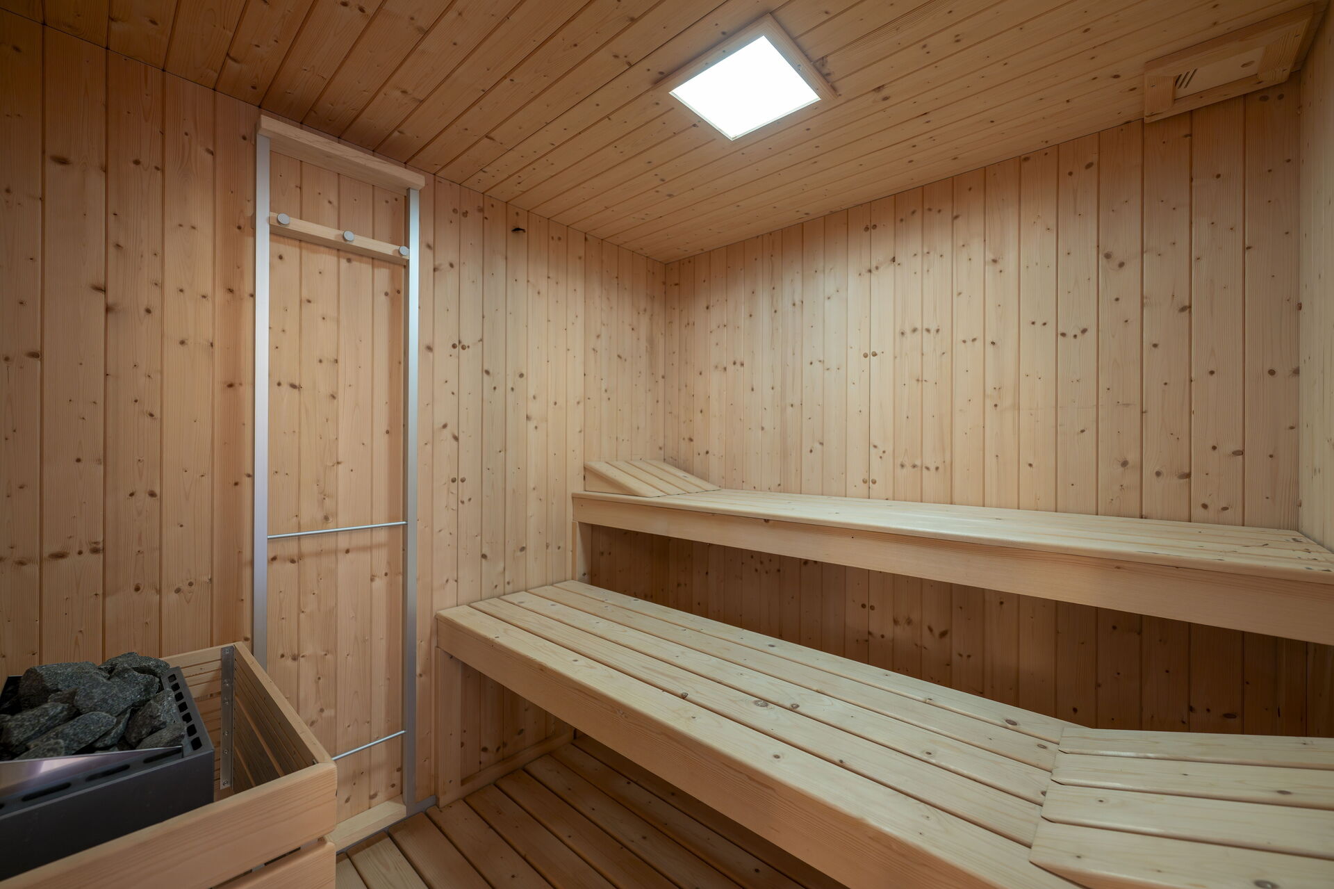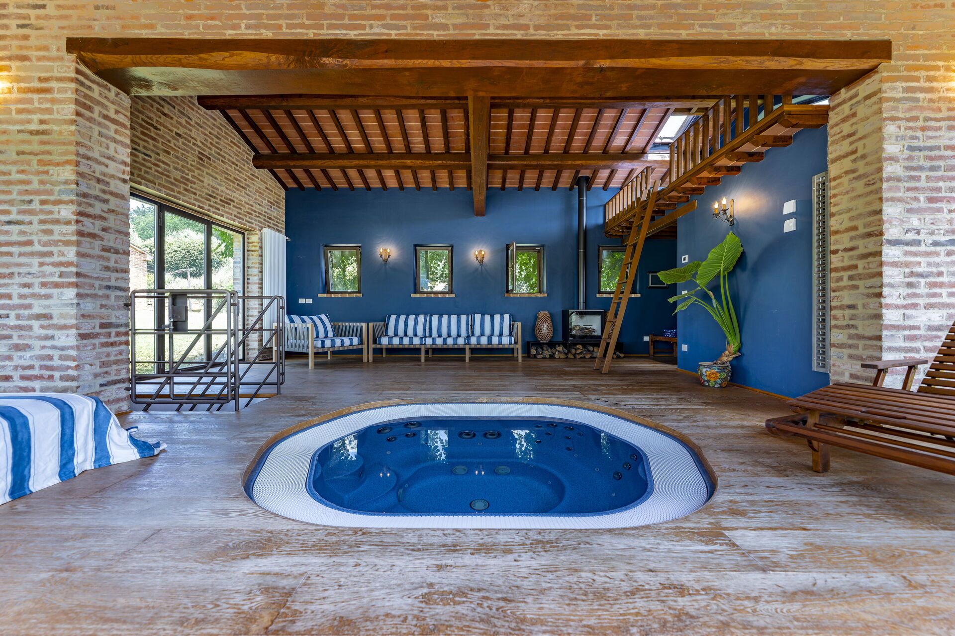 Wellnessbereich: Heißwasser-Whirlpool im Haus, Dusche, Sauna, Sonnenliege, Dampfbad.