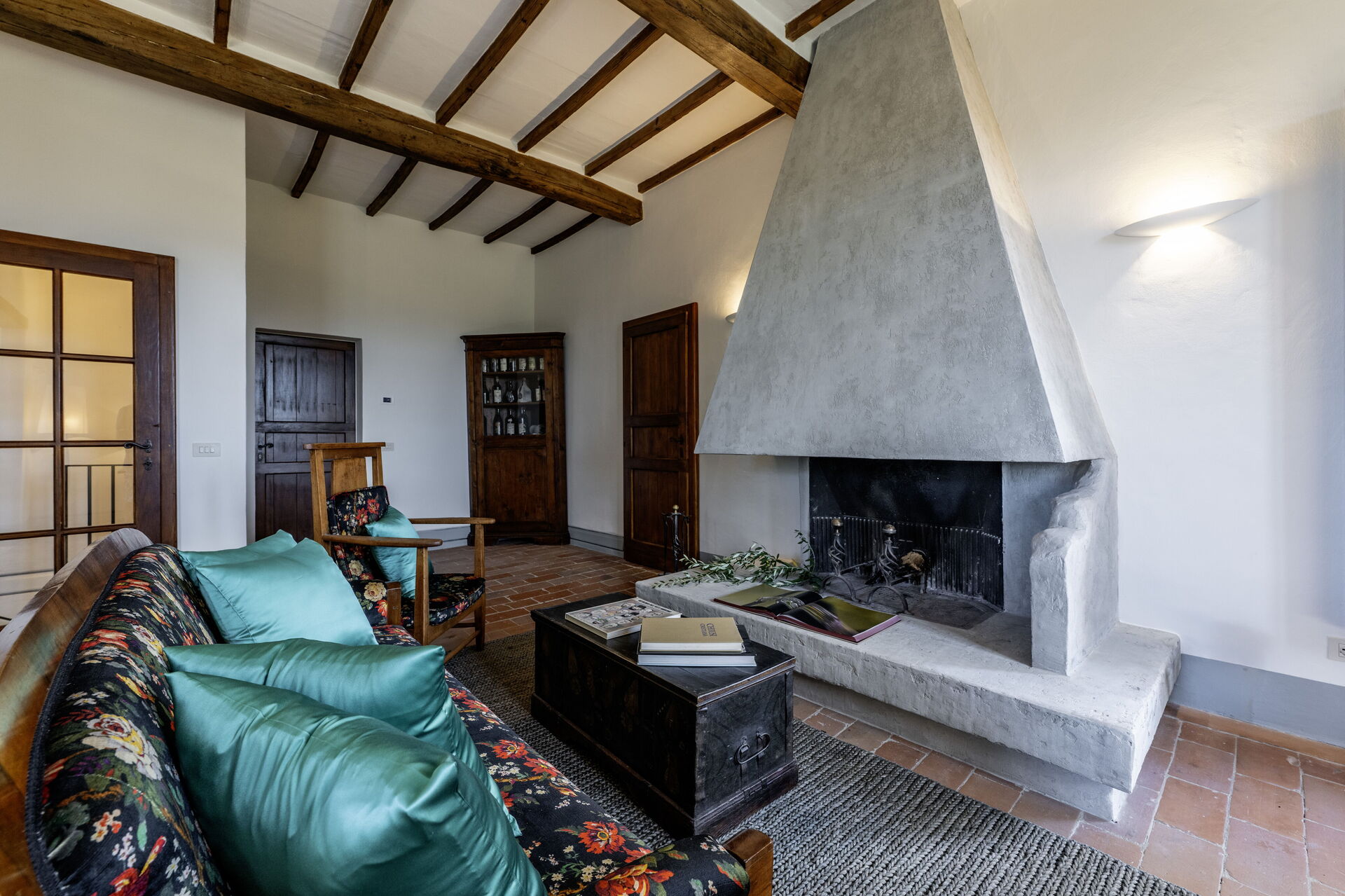 Wohnzimmer: Sofa, zwei Sessel, Schreibtisch, Kamin, WiFi Internet, TV, Ausgang auf die Veranda.