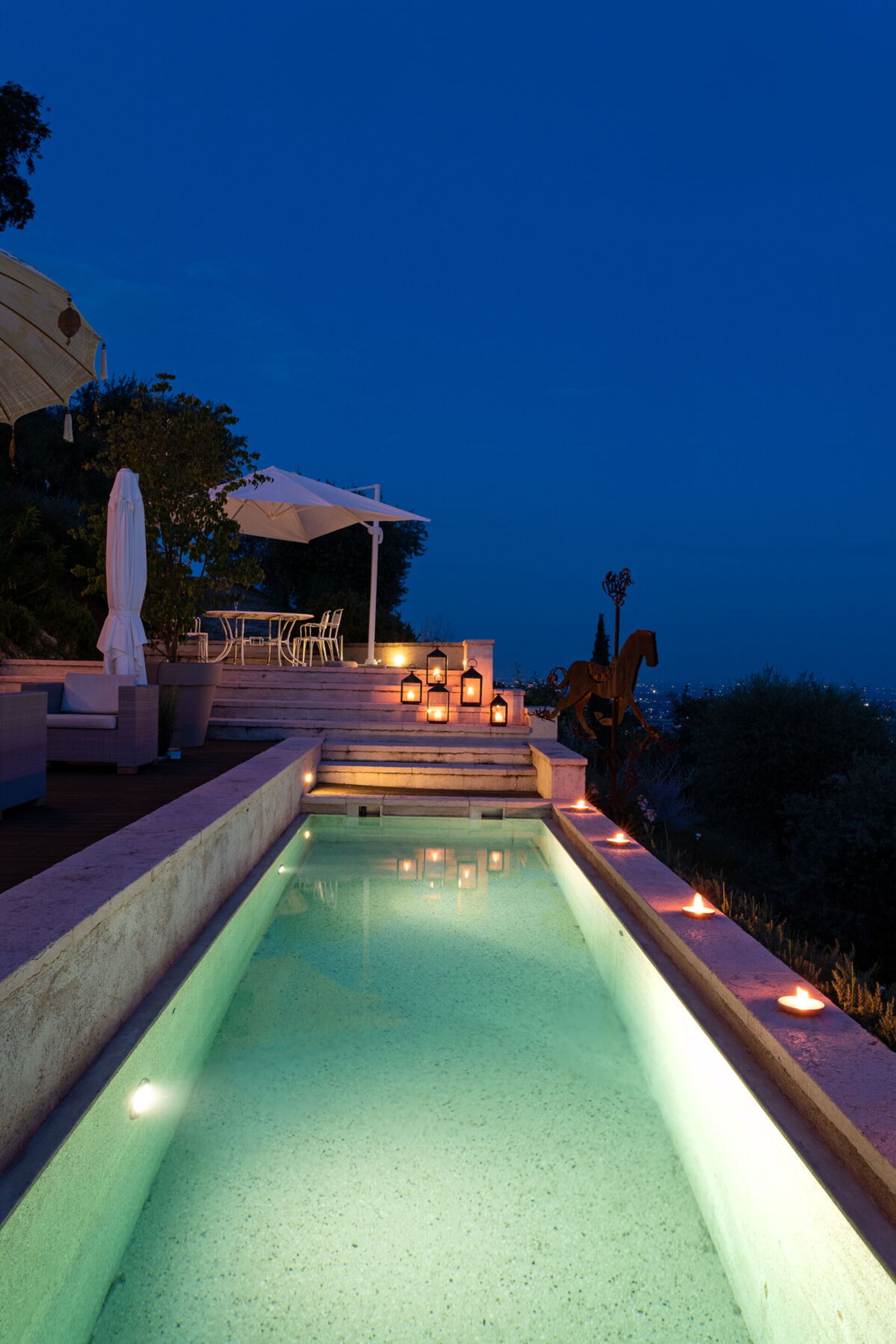 Diese Villa bietet Unterkunft für 6 Gäste in 3 Schlafzimmern und 3 Badezimmern auf einer Fläche von 300 Quadratmetern, verteilt über drei Ebenen. Sie betreten die Villa durch die Eingangstür und gelangen in einen großen offenen Wohn- und Essbereich im Erdgeschoss. Das großzügige Wohnzimmer verfügt über komfortable Sitzgelegenheiten und geht fließend in den Essbereich über, der einen quadratischen Tisch für bis zu 8 Gäste umfasst. Angrenzend an den Essbereich finden Sie die moderne und geräumige Küche, die ebenfalls über einen charmanten antiken Tisch verfügt. Ein Gästebad befindet sich praktischerweise direkt neben der Küche, und französische Fenster öffnen sich vom Wohnzimmer auf die Panoramaterrasse und den Poolbereich. Eine Treppe mit 16 Stufen führt in den zweiten Stock, wo sich 2 Schlafzimmer befinden. Das erste Schlafzimmer verfügt über ein Doppelbett mit den Maßen 180x200 und ein angrenzendes Badezimmer mit Dusche. Das zweite Schlafzimmer bietet ebenfalls ein Doppelbett mit denselben Maßen, 180x200, und verfügt über ein eigenes Badezimmer mit Dusche. Beide Schlafzimmer profitieren von nach Süden ausgerichteten Fenstern mit Blick auf den Garten. Zusätzlich befindet sich auf dieser Etage eine Waschküche. Das Hauptschlafzimmer befindet sich im dritten Stock, erreichbar über 15 Stufen, und bietet direkten Zugang zu einer privaten Terrasse und dem hinteren oberen Garten. Das luxuriöse Badezimmer verfügt über eine große Badewanne aus Vicenza-Stein mit den Maßen 1,58 x 76 sowie eine separate Dusche. Das dritte Badezimmer ist nicht direkt ans Schlafzimmer angeschlossen. Die Schlafzimmer verfügen über Betten mit 2 Matratzen, sodass Sie auf Wunsch Einzelbettwäsche anfordern können.