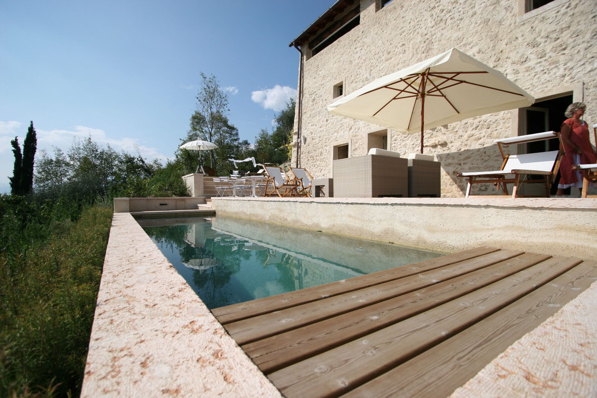 Die Villa ist mit Klimaanlage im Wohnzimmer und in den Schlafzimmern ausgestattet, die Ihren Komfort während Ihres gesamten Urlaubs gewährleistet. Wärme ist durch Zentralheizung verfügbar und sorgt in kühleren Monaten für Behaglichkeit. Das großzügige Wohnzimmer verfügt über einen funktionsfähigen Kamin, der zum raffinierten Ambiente der Immobilie beiträgt. Zu den Unterhaltungsmöglichkeiten gehören Satellitenfernsehen, ein Fernsehgerät und eine CD-Player-Stereoanlage. Die moderne Küche ist komplett ausgestattet mit Geschirrspüler, Mikrowelle, Herd, großem Kühlschrank und Backofen und erfüllt alle Ihre kulinarischen Bedürfnisse. Die Waschküche im zweiten Stock umfasst eine Waschmaschine und einen Trockner. Sie werden das Leben im Freien auf der privaten Terrasse und der Panoramaterrasse genießen, die mit Liegestühlen und Sonnenschirmen ausgestattet sind und einen idealen Rahmen für Entspannung und Mahlzeiten im Freien bieten, während Sie die herrliche Aussicht auf das Tal genießen. Ein Grill steht Ihnen zur Verfügung. Die Immobilie verfügt über einen privaten Garten mit einer Fläche von 5 Hektar oder 12 Acres, der die erhöhte Hügellage voll ausnutzt und einen außergewöhnlichen Panoramablick bietet. Das luxuriöse Badezimmer des Hauptschlafzimmers verfügt über eine Whirlpool-Badewanne aus Vicenza-Stein. Hochgeschwindigkeits-ADSL-WIFI-Internetverbindung ist im gesamten Anwesen verfügbar, und Sie profitieren von einem Sicherheitssystem für Ihre Sicherheit.