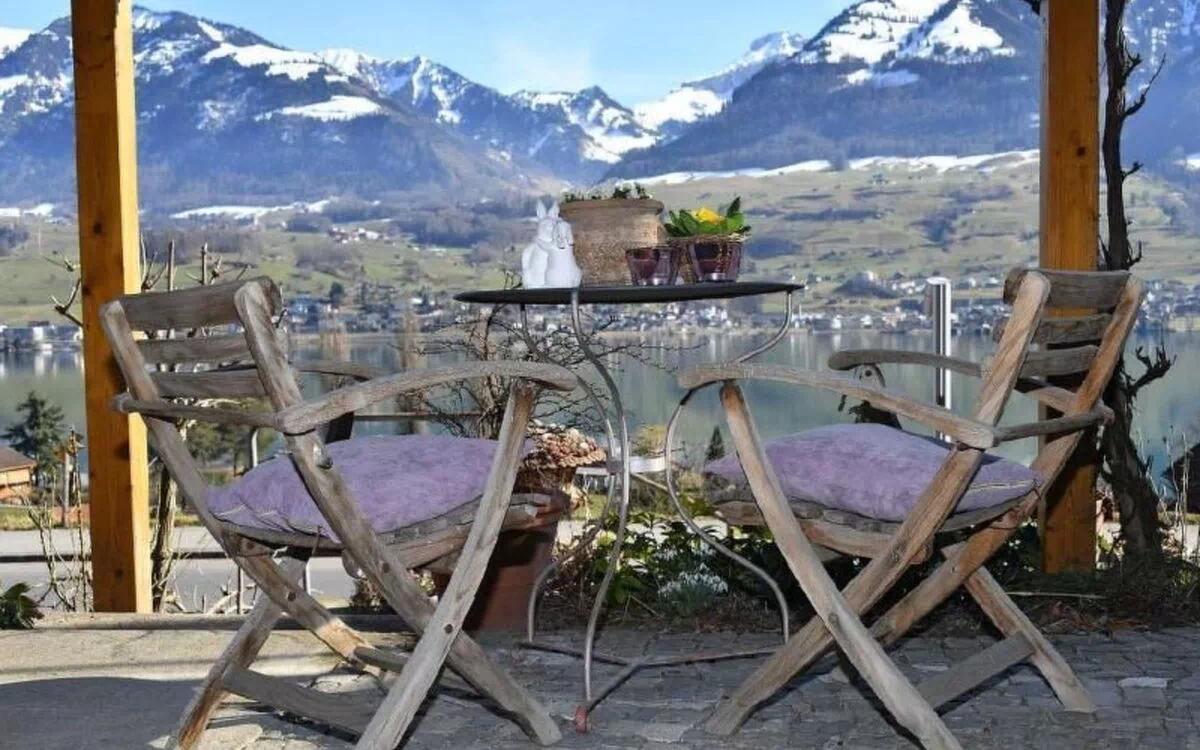 Im Aussenbereich laden 2 kleine Sitzplätze zum Verweilen ein. Von hier schweift der Blick über den kleinen Garten zum See und zu den Bergen.
