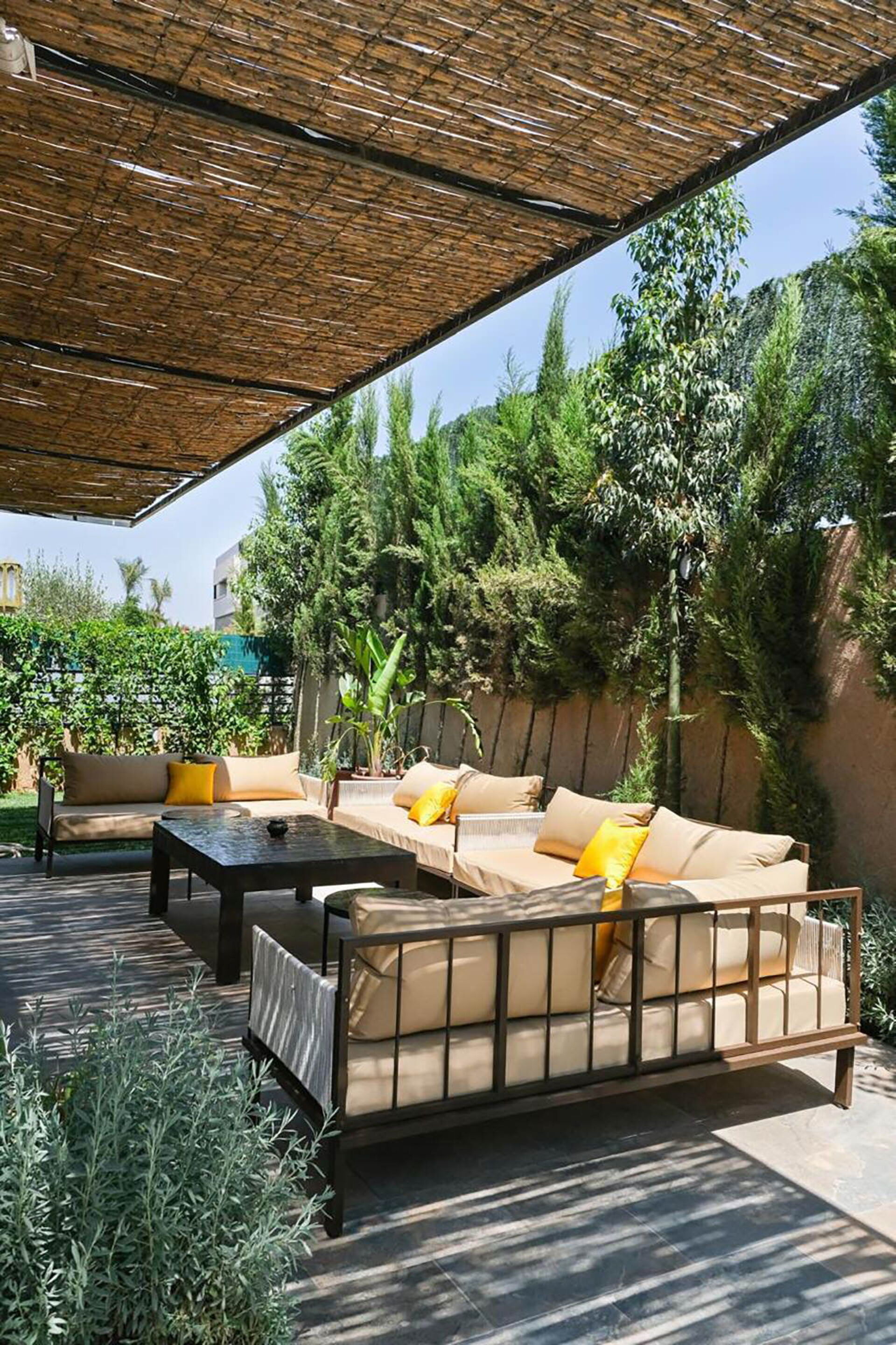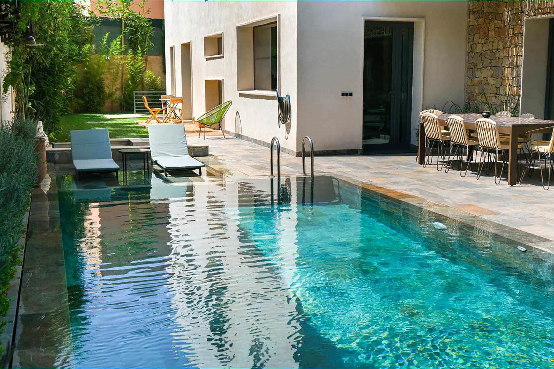 Die Außenbereiche der Villa Habiba schaffen eine friedliche und luxuriöse Umgebung. Der Mittelpunkt ist der großartige Infinity-Pool, perfekt positioniert, um die Wärme der Marrakescher Sonne zu genießen und dabei ungestörte Ausblicke auf die umliegende Landschaft zu haben. Komfortable Sonnenliegen sind rund um den Pool angeordnet. Elegante Loungenmöbel im Außenbereich und ein dedizierter Essbereich laden zu unvergesslichen Mahlzeiten unter freiem Himmel ein. Der wunderschön gestaltete Garten mit üppigem Grün rahmt den gesamten Außenraum ein und sorgt für Privatsphäre und natürliche Harmonie.