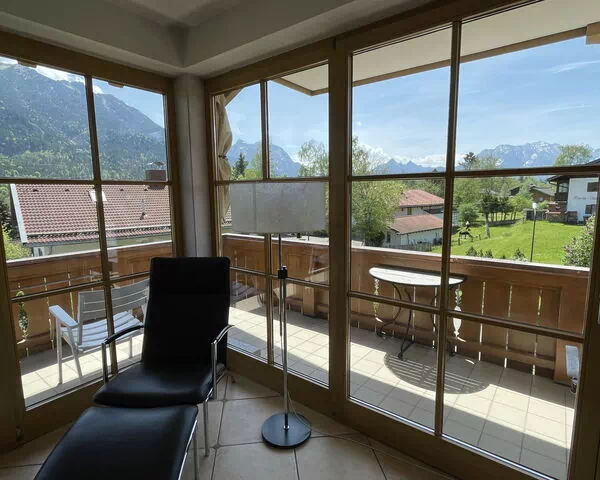 Die Ferienwohnung umfasst 92 m² auf dem Erdgeschoss und ist als Dreizimmerapartment für maximal 4 Gäste ausgelegt. Sie verfügt über 2 Schlafzimmer und 2 Bäder. Das erste Schlafzimmer ist mit 2 Einzelbetten ausgestattet, das zweite mit einem Doppelbett. Das erste Bad verfügt über eine Dusche und WC, das zweite Bad ist mit einer Badewanne, einer Dusche und WC ausgestattet. Das Wohnzimmer öffnet sich direkt zu einem südausgerichteten Balkon von 16 m², von dem aus ein Panoramablick auf die Berge Karwendel, Stubai und Wetterstein sowie die Zugspitze zu genießen ist. Die Küche ist mit einer Eckbank und einem Esstisch ausgestattet. Die Ferienwohnung verfügt über Parkett- und Terrakottaböden sowie hochwertige Designermöbel.