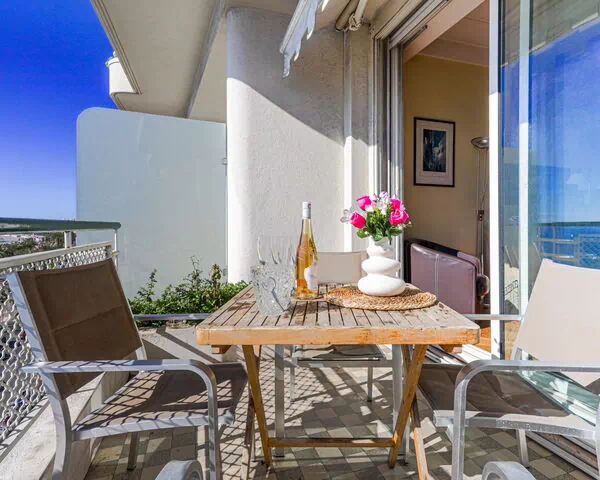 Die Ferienwohnung umfasst 55 m² auf einer Etage und befindet sich im 4. Obergeschoss. Sie bietet Platz für bis zu 4 Gäste und verfügt über 1 Schlafbereich und 1 Bad. Der Wohn- und Essbereich ist mit einem Doppelschlafsofa (140 cm × 190 cm), einem Esstisch und direktem Zugang zur Terrasse ausgestattet. Ein separater, durch einen Vorhang abgetrennter Alkoven beherbergt ein Französisches Bett (160 cm × 200 cm) als zusätzlichen Schlafbereich. Die Schlafbereiche befinden sich in offenen Raumkonfigurationen und nicht in abgeschlossenen Schlafzimmern. Die Küche ist vollständig ausgestattet und räumlich abgetrennt. Das Bad ist mit einer Dusche und separatem WC ausgestattet. Die gesamte Wohnung ist mit Parkettböden ausgelegt. Eine nach Süden ausgerichtete Terrasse von 6 m² mit Terrassenmöbeln und Panoramameerblick schließt direkt an den Wohnbereich an.