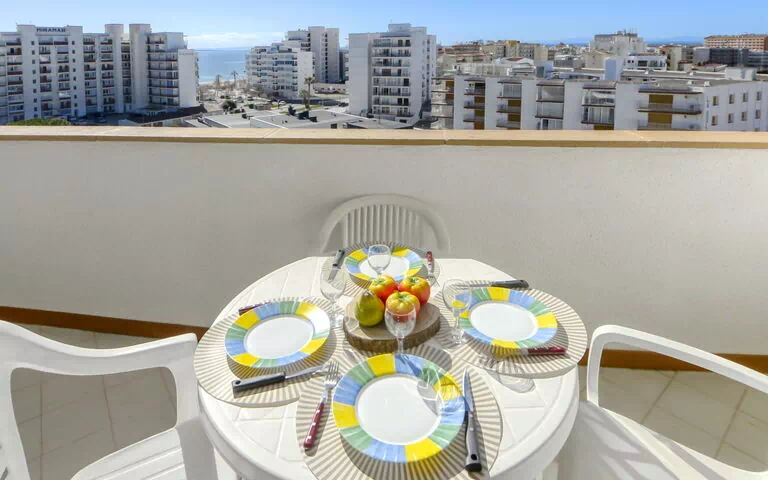 Die Ferienwohnung umfasst 35 m² auf dem 5. Obergeschoss und bietet Platz für bis zu 3 Gäste in 1 Schlafzimmer und 1 Bad. Das Schlafzimmer ist mit einem Französischen Bett ausgestattet. Der Wohn- und Essbereich ist einfach möbliert und verfügt über ein Schlafsofa; von hier führt eine Tür direkt auf den Balkon mit Teilblick auf Meer und Berge.