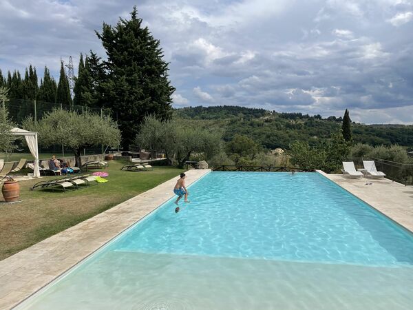 Die weitgehend ausgestatteten Außenräume. Im Außenbereich mit Rasenflächen und Olivenbäumen gibt es ein kleines Fußballfeld, einen Tennisplatz sowie einen großen Pool (20 x 8 m, Tiefe 1,20-1,80 m) mit strandartigem Zugang und eindrucksvollem Ausblick auf das darunter liegende Tal sowie die umliegende Hügellandschaft. Jede der Ferienwohnungen verfügt über einen privaten Außenbereich mit Tisch und Stühlen, der sich sowohl zum Essen im Freien als auch zum Entspannen und zum Bewundern der einzigartigen Hügellandschaft des Chianti Gebietes eignet. Frieden und Stille sind die eigentümlichen Eigenschaften dieses einsamen und geschichtsträchtigen Dörfchens, eingebettet in eines der schönsten Täler des Chianti.