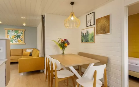 "Comfort Cottage", 4-Zimmer-Reihenhaus 64 m2. Komfortabel eingerichtet: Wohn-/Esszimmer mit offenem Kamin, Esstisch und Flachbildschirm. Ausgang zur Terrasse. 2 Doppelzimmer, jedes Zimmer mit 2 Betten. 1 Zimmer mit 1 Bett. Offene Küche (4 Kochplatten, Geschirrspüler, Toaster, Wasserkocher, elektrische Kaffeemaschine, Kombinationsmikrowelle). Dusche/WC. Heizung. Terrasse. Terrassenmöbel. Zur Verfügung: Kinderhochstuhl, Babybett. Internet (Wireless LAN, gratis). Bitte beachten: Rauchmelder.