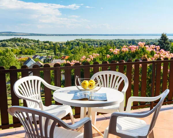 Das Ferienhaus „Panorama" liegt im charmanten Dorf Vonyarcvashegy, etwa 7 km von der historischen Stadt Keszthely in Ungarn entfernt. Das gemütliche dreistöckige Haus steht auf einem ruhigen und sonnigen Grundstück am Ortsrand, umgeben von malerischen Weinbergen und nur 50 m vom Waldrand entfernt. Das Anwesen verfügt über ein großzügiges Privatgrundstück von 700 m² mit einer gepflegten Rasenfläche von 200 m², auf der Bäume für Schatten und Abgeschiedenheit sorgen. Das Ferienhaus stellt einen idealen Ausgangspunkt dar, um die Region zu erkunden.