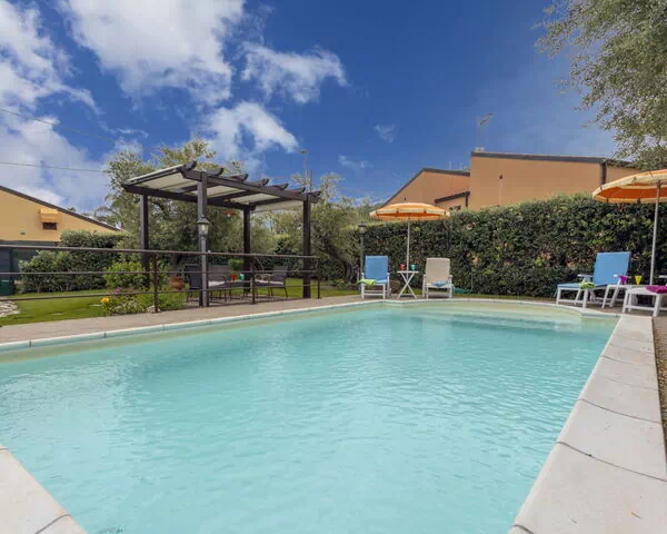 Der Garten der Villa "Olivella" ist großzügig angelegt und bietet einen grünen Rasen sowie schattige Bereiche unter etablierten Bäumen. Der Swimmingpool misst 8 x 4 Meter bei einer Tiefe von 150 cm und ist vom 1. April bis 31. Oktober verfügbar; eine Außendusche ermöglicht es den Gästen, sich nach dem Schwimmen zu erfrischen. Ein Grillbereich steht für gesellige Abende zur Verfügung, und reichlich Gartenmöbel laden zur Entspannung ein. Der Pool wird regelmäßig vom Eigentümer und Gärtner gepflegt.