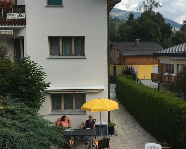 Direkt vor dem Haus wurde eine private Terrasse geschaffen, die ausschließlich den Gästen der Wohnung zur Verfügung steht. Dieser Außenbereich wird durch eine gepflegte Rasenfläche ergänzt und bietet einen angenehmen Platz zum Entspannen und Genießen der frischen Alpenluft.